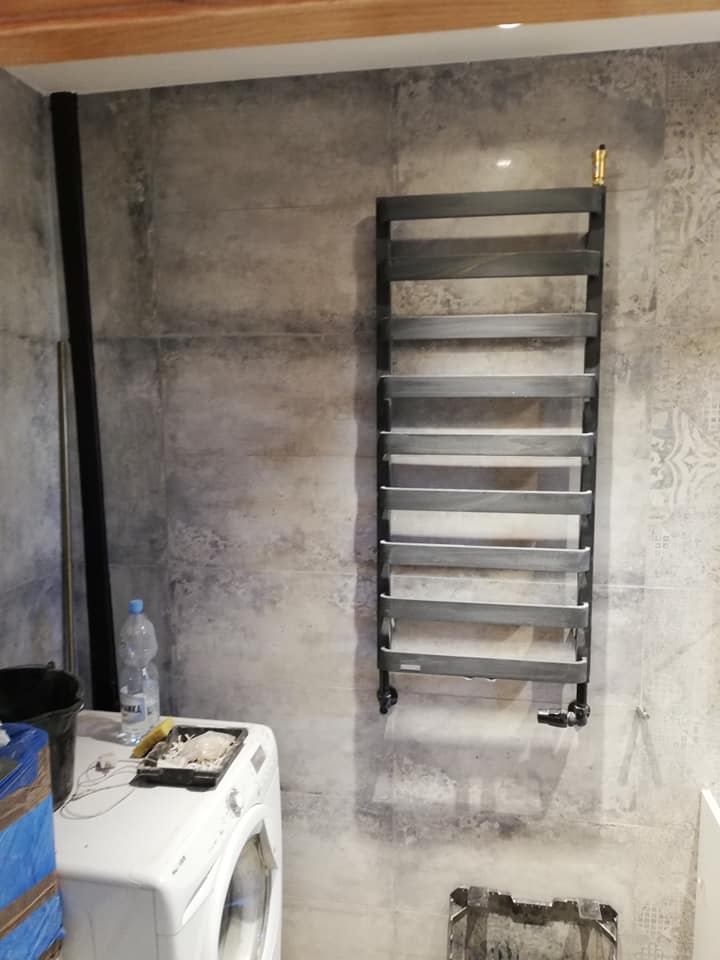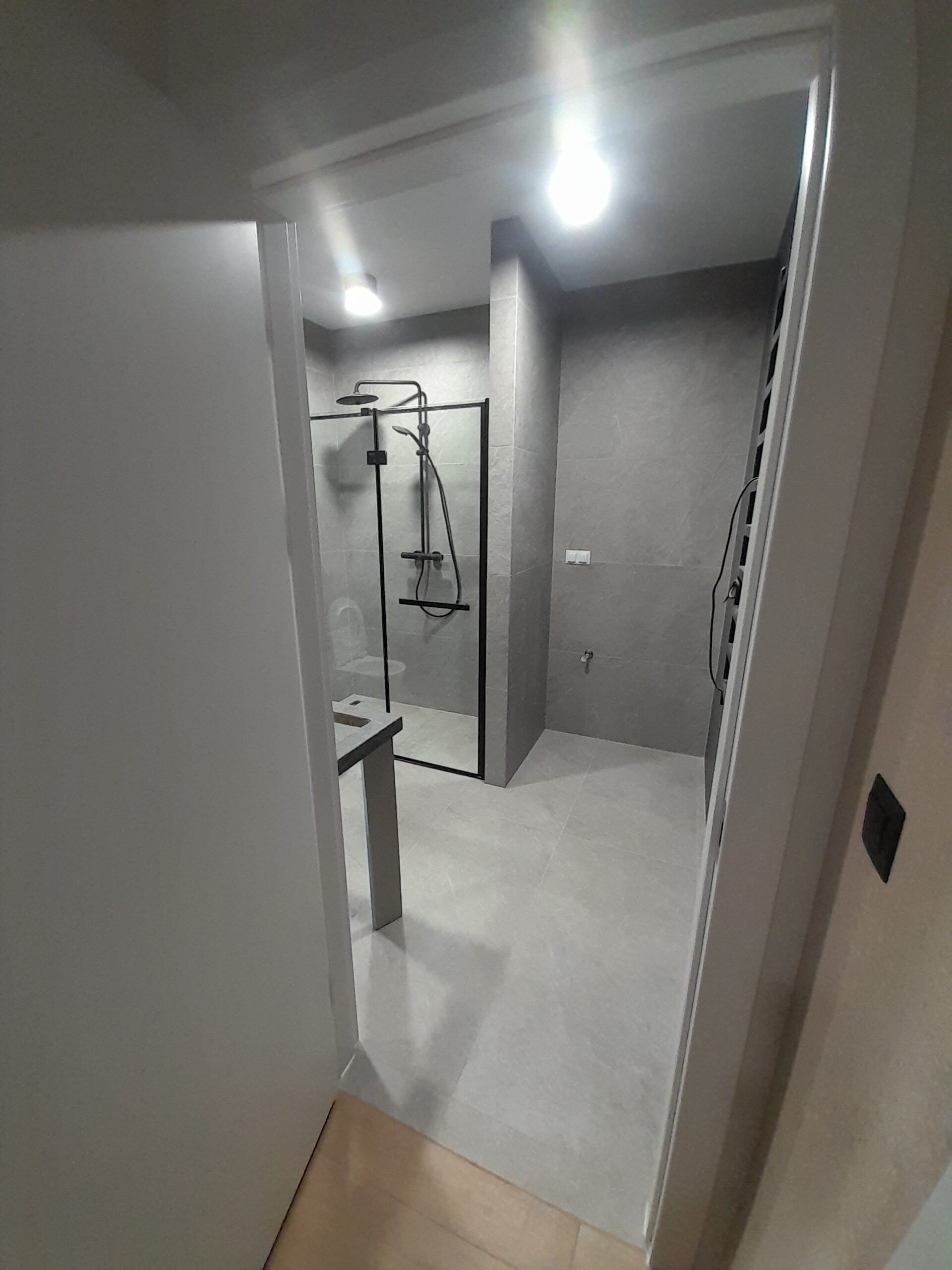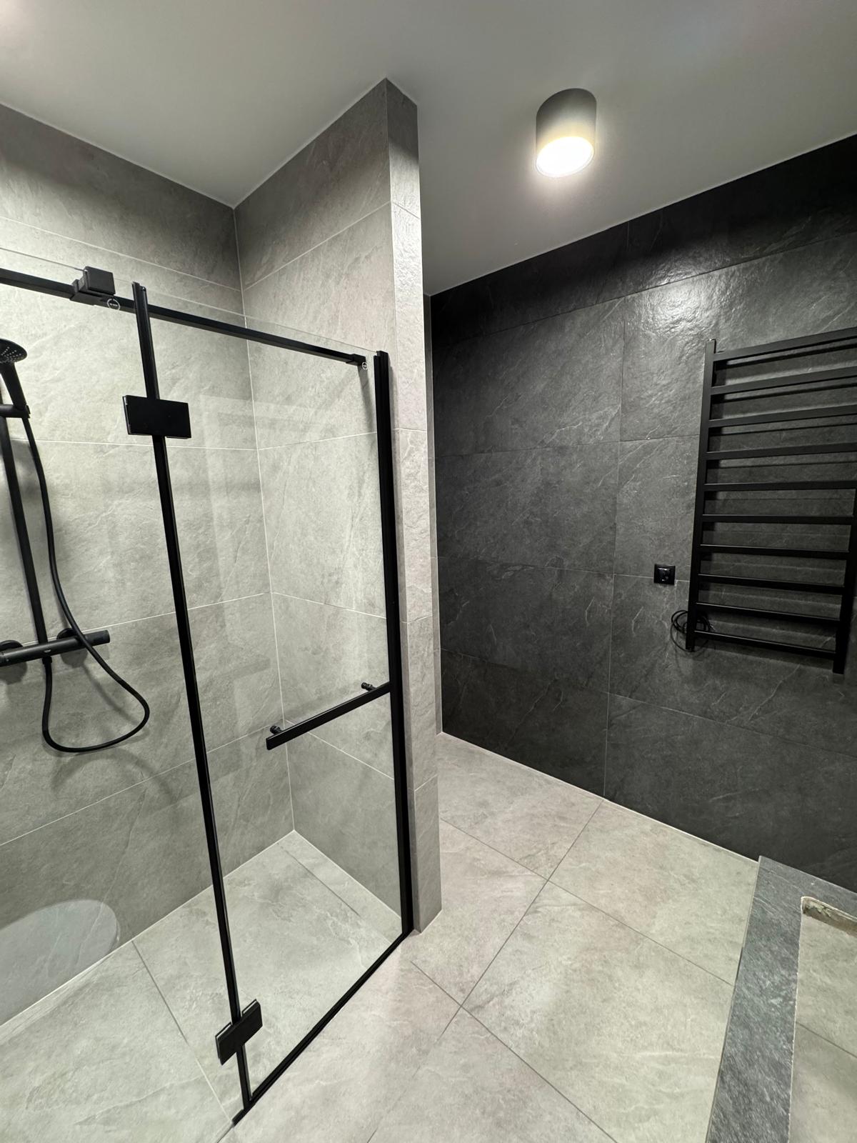 Styl wykończenia to połączenie minimalizmu i estetyki loftowej. Szare płytki ścienne o nieregularnej fakturze i jasna podłoga tworzą harmonijną bazę dla czarnych akcentów, które dodają wnętrzu głębi i nowoczesności.