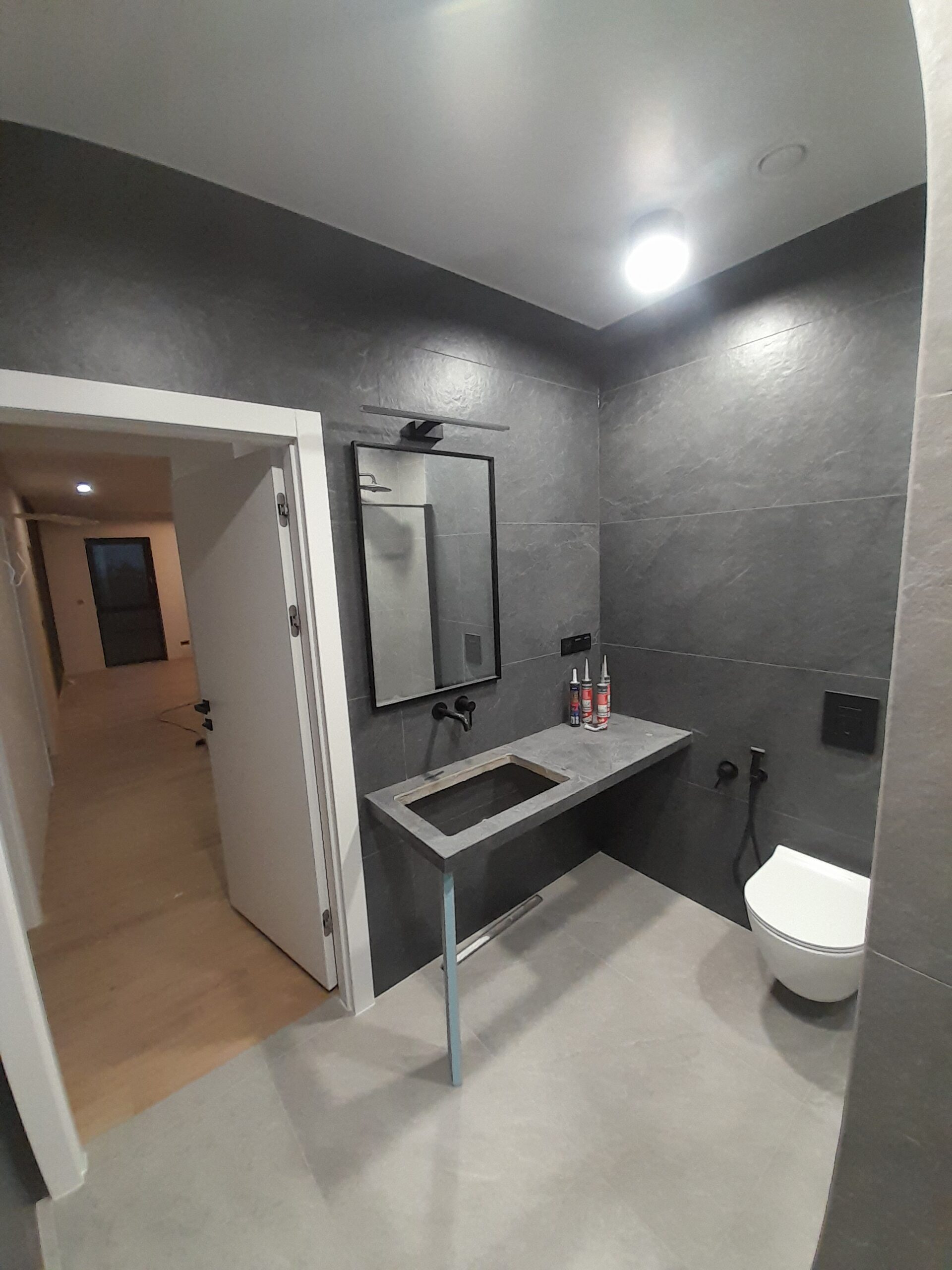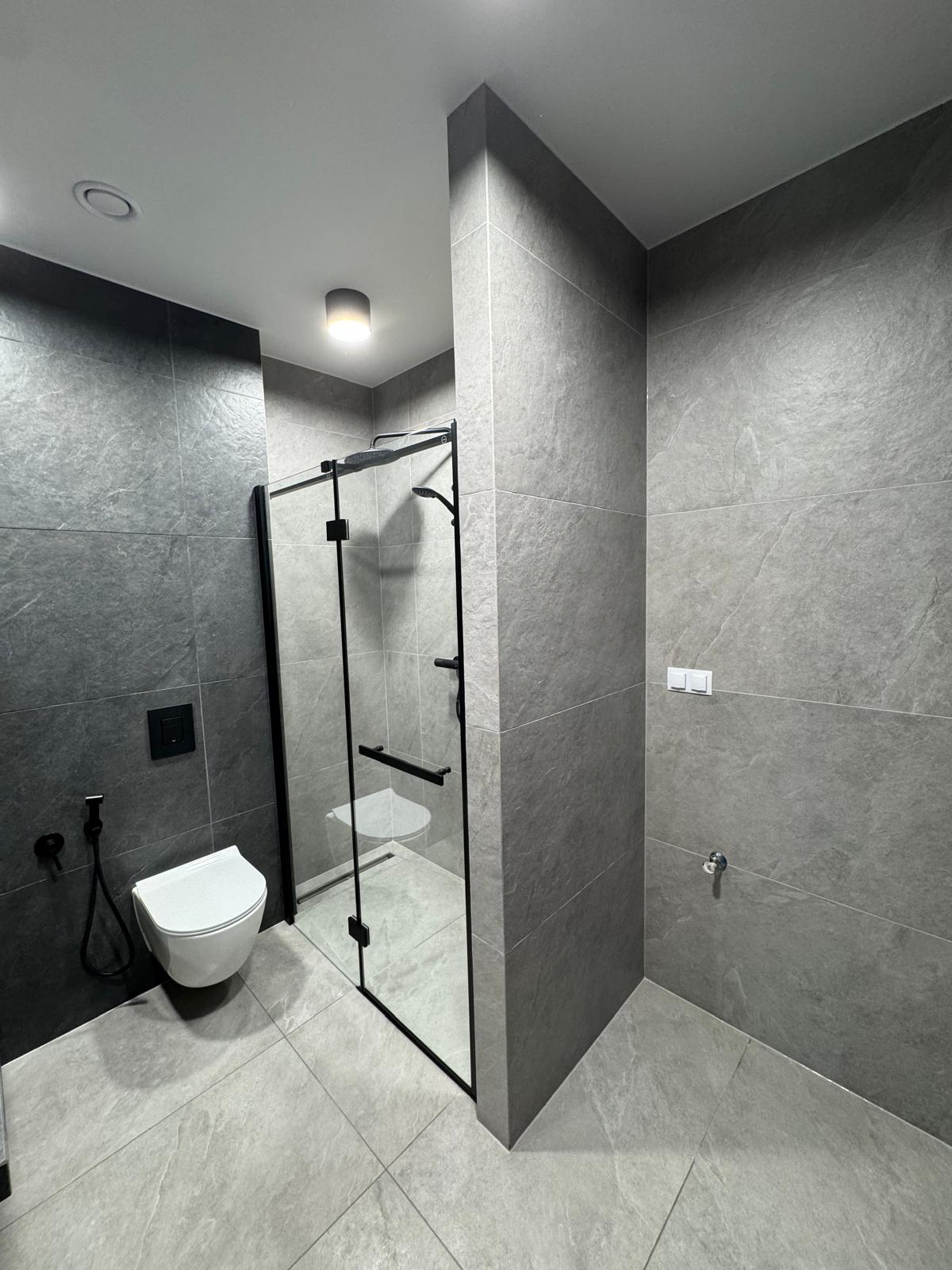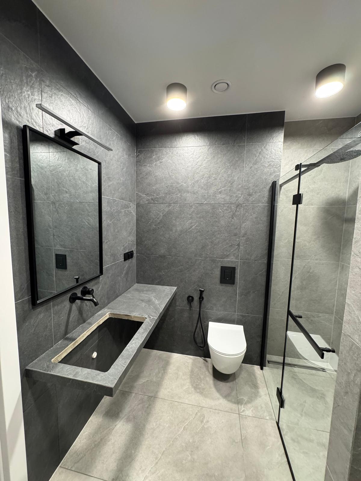 Kompleksowe Wykończenie Dwóch Łazienek: Stworzyliśmy spójne, industrialne przestrzenie. Design: Monochromatyczna paleta barw (szarość i czerń) z płytkami imitującymi kamień naturalny.