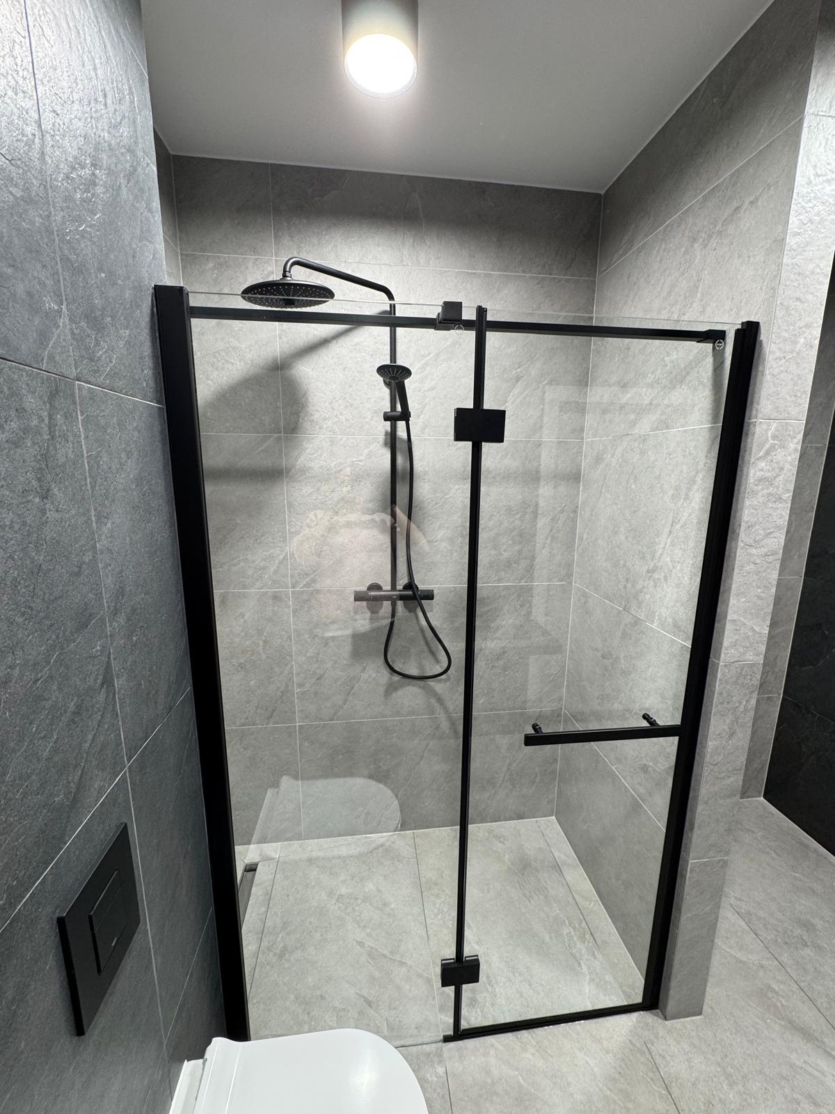 Kabina Prysznicowa: Nowoczesna, przeszklona kabina typu Walk-In z czarnymi profilami.