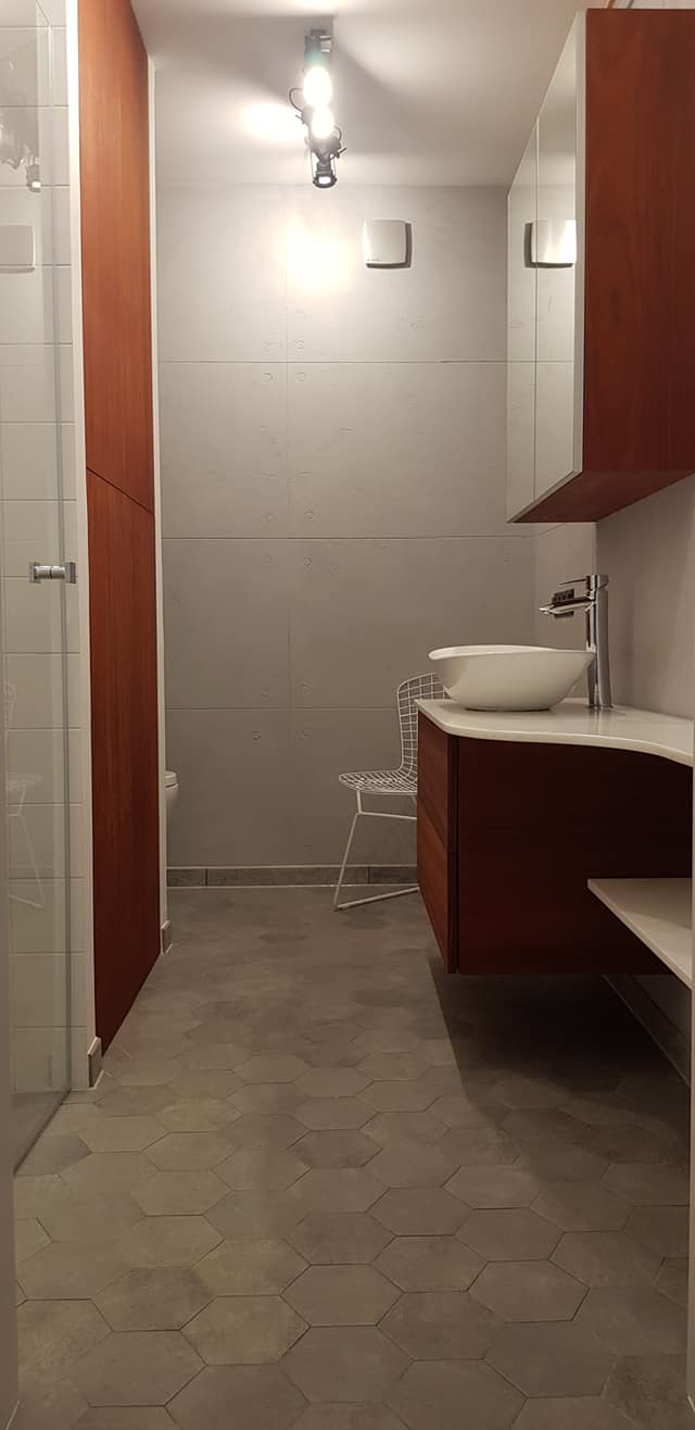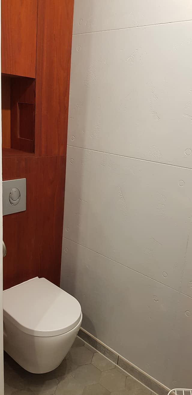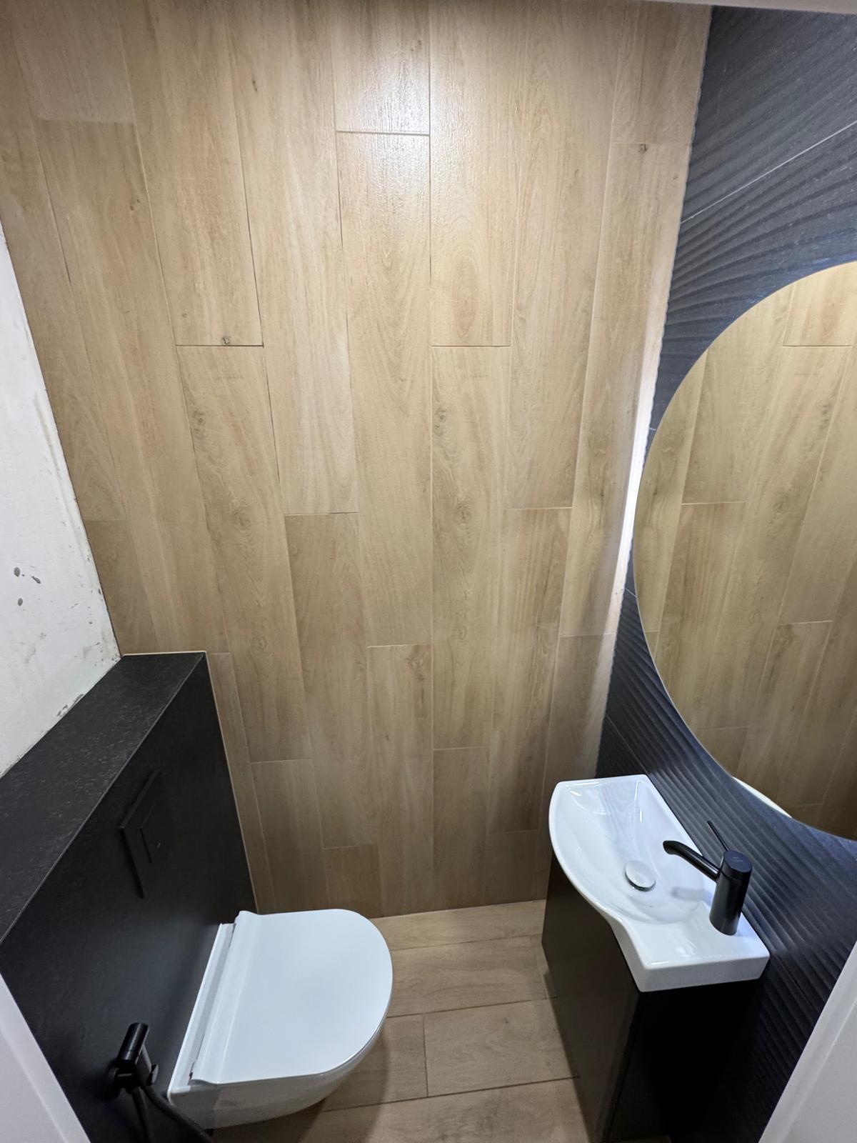 W pierwszej łazience postawiliśmy na połączenie surowości z ciepłem. Wykorzystaliśmy tutaj płytki o zróżnicowanej teksturze i wzornictwie, łącząc gładkie powierzchnie z motywami patchworkowymi i betonopodobnymi, co dało unikatowy i intrygujący efekt. Pomimo nietypowego kształtu pomieszczenia, każda płytka została ułożona z chirurgiczną precyzją, tworząc spójną i harmonijną całość. Z kolei druga łazienka to przykład eleganckiego minimalizmu – połączenie ciepłego drewna z błyszczącą czernią nadaje jej nowoczesnego i luksusowego charakteru.