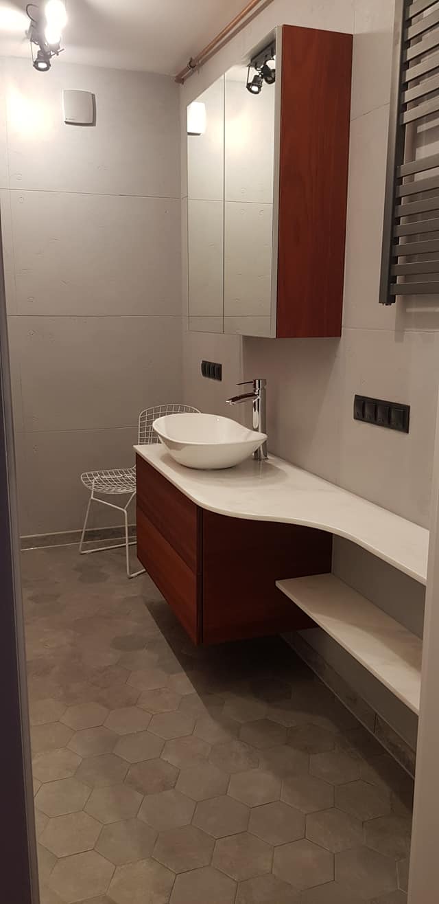 W aneksie kuchennym postawiliśmy na połączenie nowoczesności z tradycją. Jasne, lakierowane szafki górne odbijają światło, optycznie powiększając przestrzeń, natomiast dolne fronty z naturalnego drewna dodają ciepła i nawiązują do reszty aranżacji. Pod blatem króluje biała glazura o matowym wykończeniu. W łazience kontynuujemy motyw tekstur, wykorzystując tynk czesany i tynki dekoracyjne na ścianach, co dodaje pomieszczeniu unikalnego, rzemieślniczego charakteru. Podłoga z heksagonalnych płytek to nowoczesny akcent, który pięknie komponuje się z drewnianymi elementami zabudowy, wykonanymi przez naszego zaufanego stolarza.